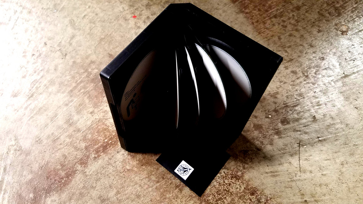 Eight white duplicated/printed 5" discs, packaged in a sturdy black plastic case (about the size and shape of a VHS tape), with a wraparound chipboard insert bearing custom text-sticker work on the spine and back cover, and a 4x4" glossy photo print affixed on the front cover. The ninth disc is a white 3" mini-CD-R contained inside the case, in its own black paper sleeve. NOTE: 3" CD-Rs are playable only on tray-based CD players, not slot-input players.