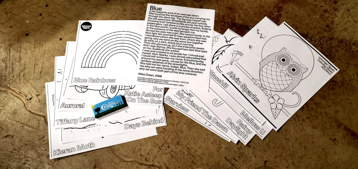 Assembled by hand, one copy at a time, in the White Pillar Workshop! Three white 5" recordable discs, printed and duplicated via an Imation D20, held securely inside a triple-disc jewel case, with a kraft cardstock insert bearing a 4x4" glossy photographic print panel on the front cover, a large text sticker on the inside cover and another white text label on the bottom of the jewel case itself. Also includes one of twelve different folded Milieu coloring sheets, each with Mike Dolan's original "Blue" poem reprinted on the back, and a set of 4 boxed crayons (red, yellow, blue and green).